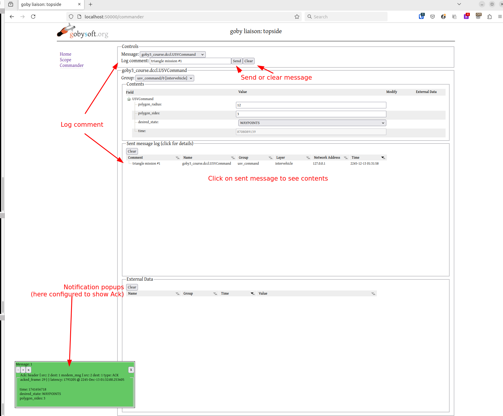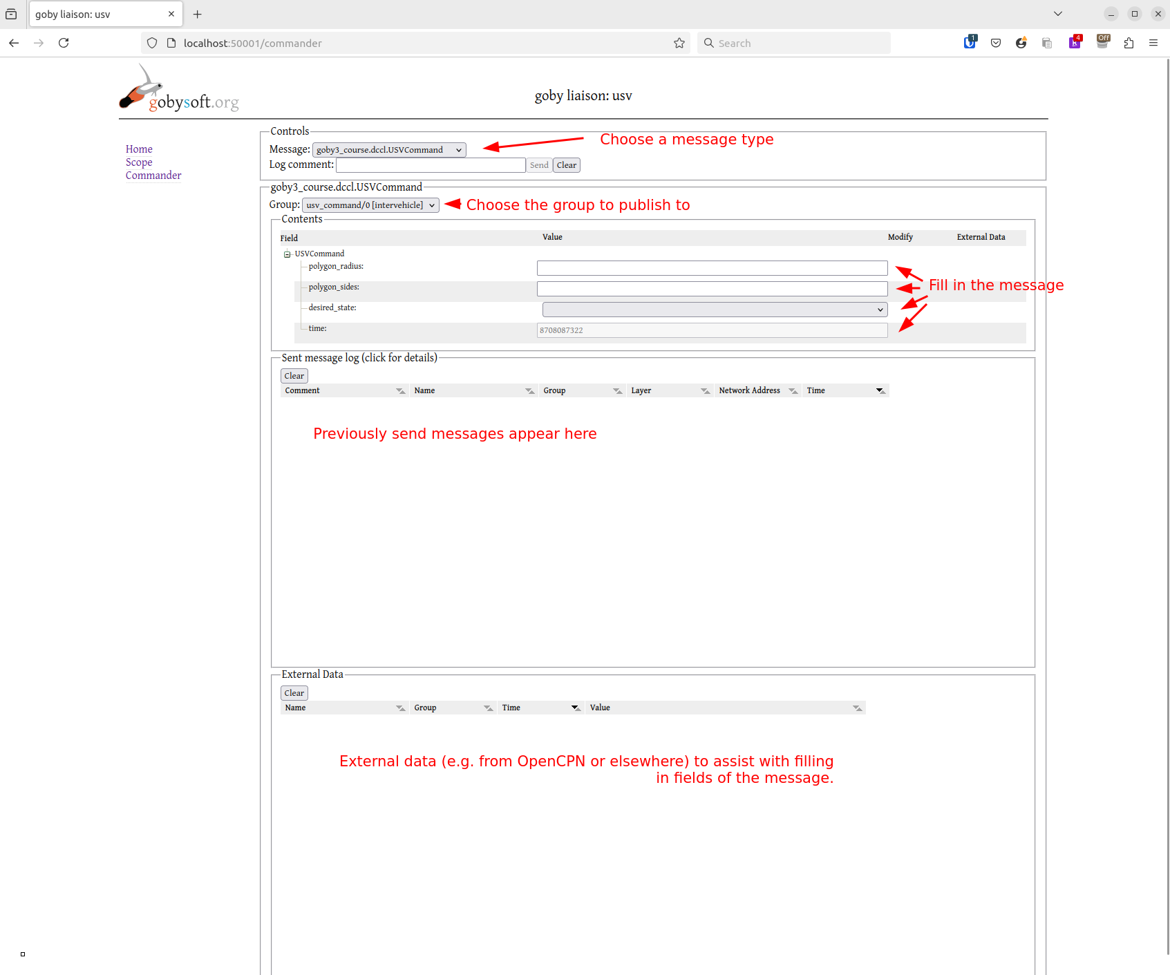 The following image shows the Liaison Commander using the USVCommand protobuf message from the Goby3 Course, before filling in the message: