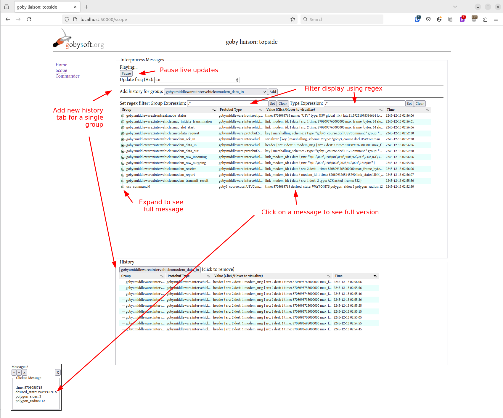 The goby_liaison Scope gives a live view of all the messages in the connected interprocess layer: